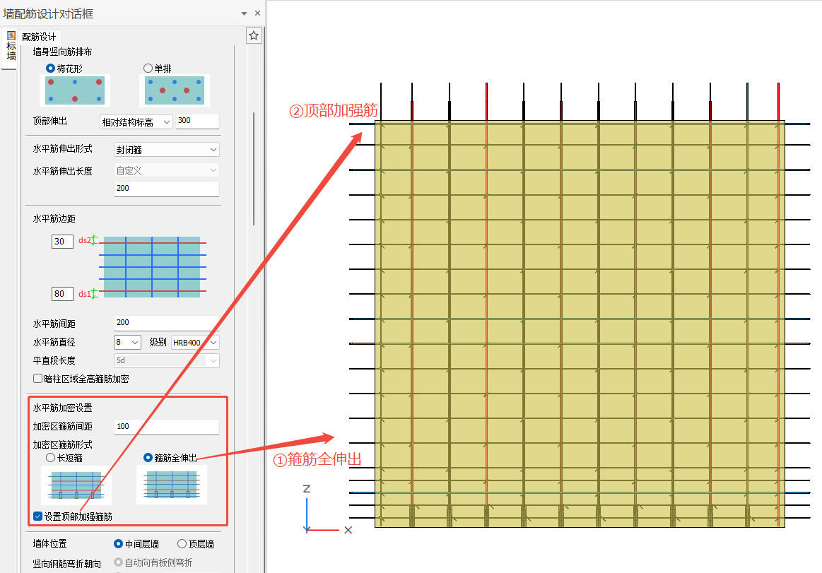 【设置顶部加强箍筋】:当勾选此项时,软件对预制墙顶部进行加强箍筋的设置。