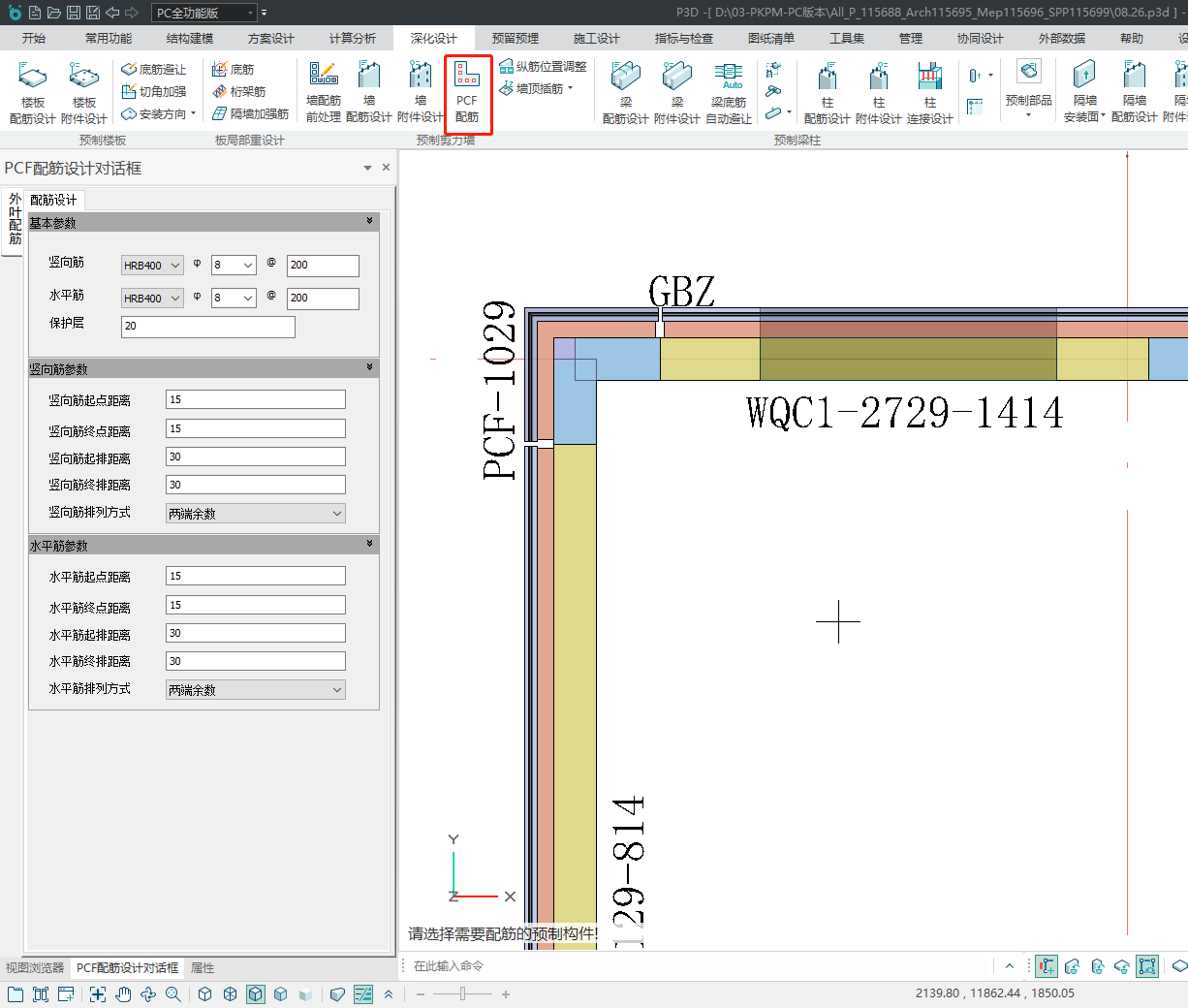 布置完成PCF之后,点击PCF配筋按钮,选择需要配筋的PCF进行配筋。
