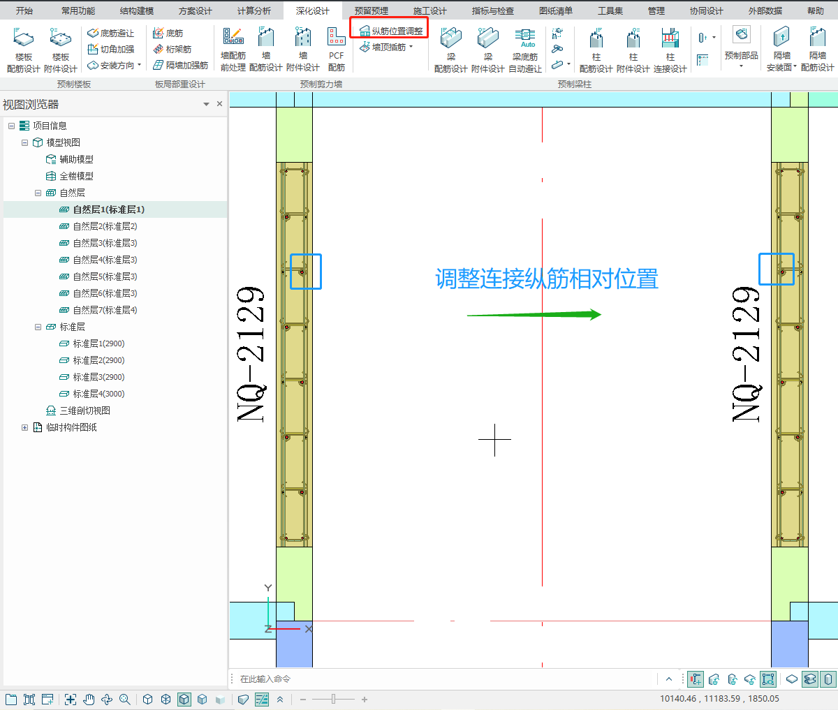 在”深化设计“选项卡-“预制剪力墙”部分增加“纵筋位置调整”工具,此工具可以调整墙身钢筋连接钢筋的相对位置,如下图所示。