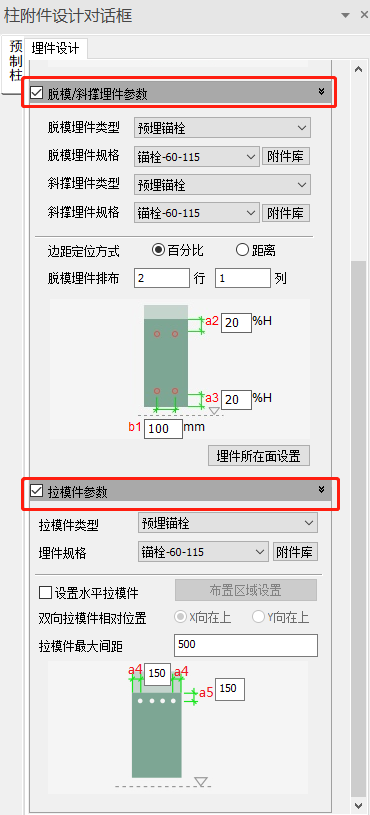 完成预制构件配筋后,用户可框选或单选预制柱进行埋件设计,包含吊装埋件、脱模/斜撑埋件及拉模件。可通过勾选/取消勾选参数栏前的方框,控制在附件设计时是否设计该类附件。