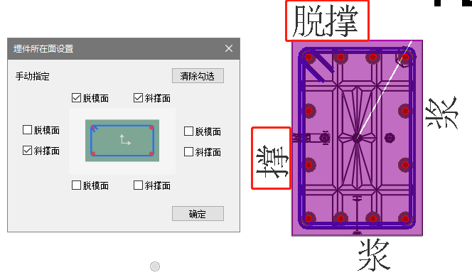 【埋件所在面设置】:根据工程需要可在此处交互指定柱子哪个侧面用于脱模,哪个侧面布置斜撑。指定后的埋件面会有文字标识(下图),完成埋件设计后即时生效。