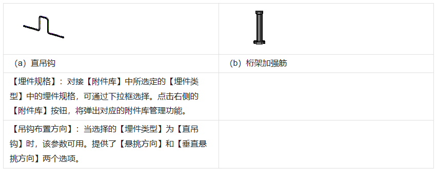 【吊钩布置方向】:当选择的【埋件类型】为【直吊钩】时,该参数可用。提供了【悬挑方向】和【垂直悬挑方向】两个选项。