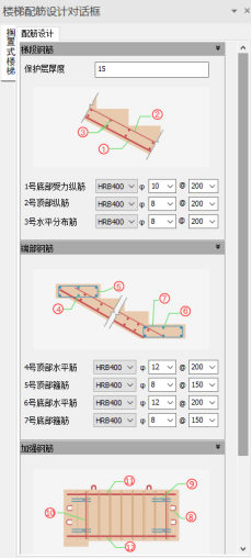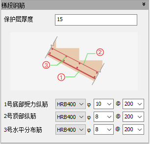 设置配筋之前,可输入梯板的混凝土保护层厚度,默认值为20mm。梯段钢筋包含1号底部受力纵筋、2号顶部纵筋和3号水平分布筋,可通过下拉菜单选择钢筋等级;通过下拉选择或手动输入的方式设置钢筋直径和排列间距。具体参数详下图: