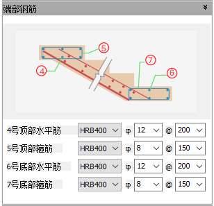 端部钢筋包含顶部和底部平直段的水平筋(4、6号钢筋)和箍筋(5、7号钢筋),可通过下拉菜单选择钢筋等级;通过下拉选择或手动输入的方式设置钢筋直径和排列间距。具体参数详下图: