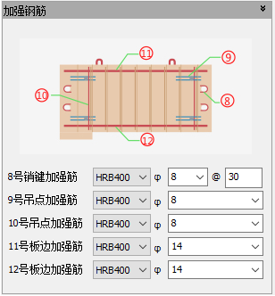 加强钢筋包含销键加强筋(8号钢筋)、吊点加强筋(10号钢筋)和板端加强筋(11、12号钢筋),可通过下拉菜单选择钢筋等级;通过下拉选择或手动输入的方式设置钢筋直径。具体参数详下图: