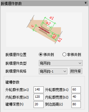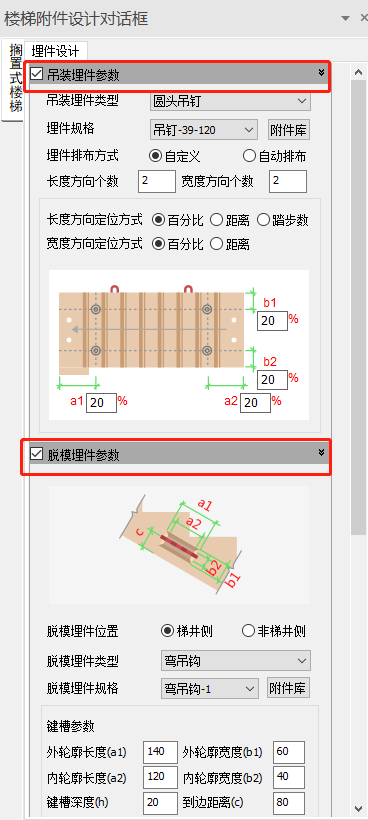 当脱模埋件类型为弯吊钩时,需设置键槽,可在键槽参数栏里输入键槽的尺寸信息和沿厚度方向的定位信息。当脱模埋件类型为圆头吊钉时,水平默认按照第二个踏步中心和延梯板厚度中心定位吊钉的位置。脱模埋件参数如图下所示。