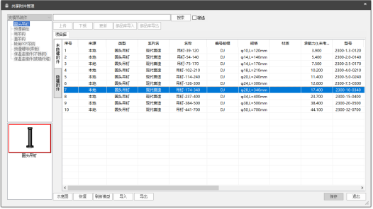 软件提供了两种吊装埋件类型:圆头吊钉和预埋锚栓。用户可用下拉菜单选择不同规格的埋件。点击“附件库”按钮直接打开共享附件库查看和修改选中埋件的相关参数,如下图所示: