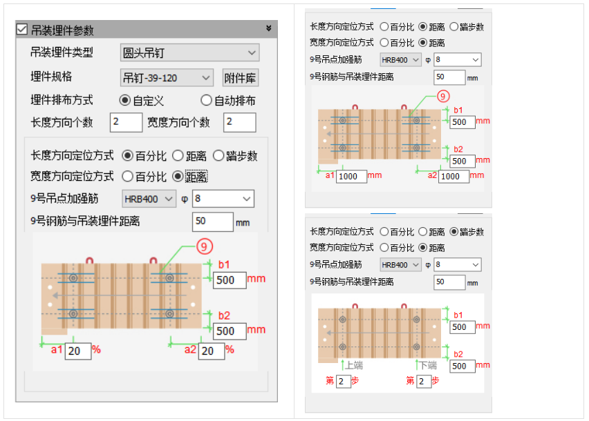 若用户选择自定义排布,长度方向的埋件边距可根据百分比、距离和踏步数的方式定位最外侧四个吊装埋件长度方向的位置;宽度方向的埋件边距可根据百分比和距离的方式定位最外侧四个吊装埋件宽度方向的位置。