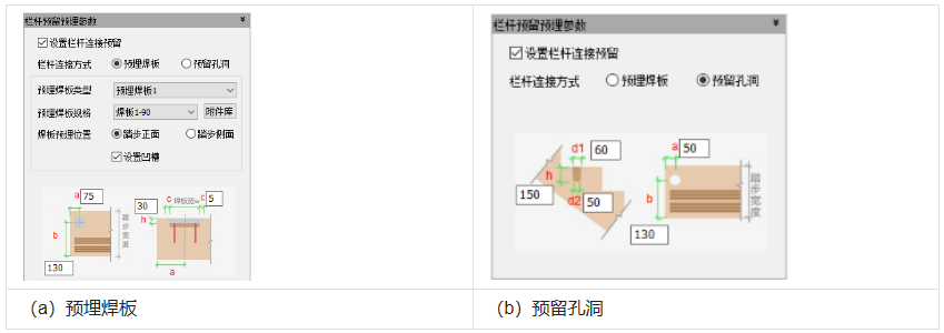 栏杆连接方式可选择预埋焊板或预留孔洞。选择预埋焊板时,可用下拉条选择焊板规格。设置位置可选择踏步正面和侧面,定位距离可在示意图中相应位置输入距离值。若勾选设置凹槽选项,同时可在示意图上修改凹槽扩出尺寸c和深度h。选择预留孔洞时,可在示意图上原位输入洞口尺寸和洞口中心距踏步边的定位,如图所示。