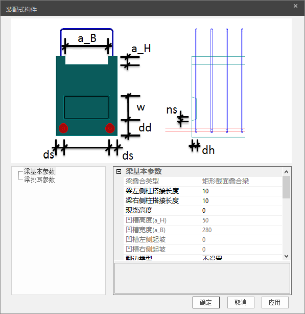 如图所示示例,用户可自由调整预制梁的基本参数和挑耳参数。单参修改工具内的修改与其他参数互相独立,互不影响。该工具内的参数与设计参数相同,详情请参阅对应章节。