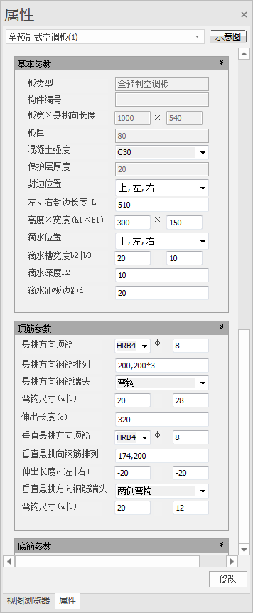 选中预制空调板,切换到【属性栏】,可以查看预制空调板属性。修改属性值,被修改的值用黄色底纹标识,点击【修改】按钮,应用修改结果。