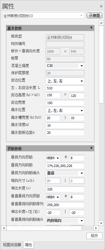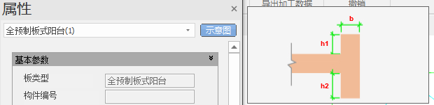 【板宽*悬挑向长度】:分别显示非悬挑方向和悬挑方向,预制阳台板混凝土的尺寸。灰显,不可修改。