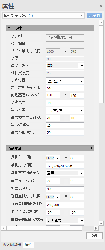 选中预制阳台板,切换到【属性栏】,可以查看预制阳台板属性。修改属性值,被修改的值用黄色底纹标识,点击【修改】按钮,应用修改结果。