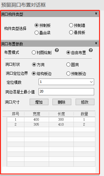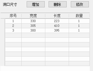 - 增加:自由布置洞口前,需点击增加,在表格中输入洞口尺寸值;