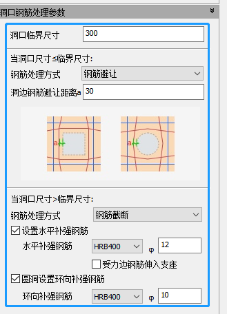 【大洞钢筋补强设置】:可勾选设置水平补强筋,以及圆洞设置环向补强筋;当选不勾选时,仅对大洞处的钢筋截断,不增加补强钢筋。