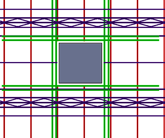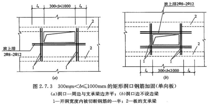【大洞处理方式】可选钢筋拉通、钢筋截断、仅截断桁架但底筋拉通,钢筋截断可设置补强钢筋,补强做法参考《混凝土结构构造手册》第二章第七节中相关条文,效果下图所示。