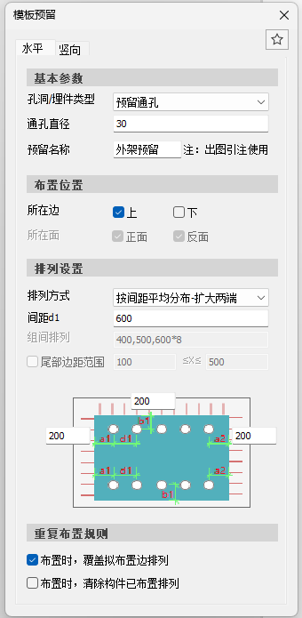 【组间排列】:当排列方式选择【自定义排布】时,各孔洞/埋件之间的距离按设置的组间间距排列(输入格式为:间距*n,间距,间距….)。