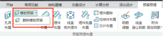 点击【预留预埋】-【模板预留】下拉点击【删除模板预留】选择构件后可删除已布置的模板预留,点击【模板预留】弹出如图所示对话框。