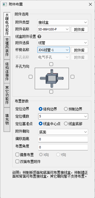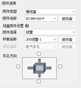 【开孔方向】:当【附件选择】中选择线管或杯梳时,示意图四周的四个勾选框开放,可供勾选设置相应方向的附属件。