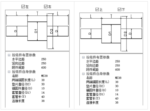 拉结件的布置方式与预埋件布置类似,可设置修改拉结件的定位参数与外形参数,然后选择需布置的预制构件,布置方式可选水平布置或竖向布置,勾选左/右或上/下可设置竖向单双列或上下行。