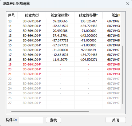 完成避让后,可弹窗选择显示线盒避让钢筋清单,其中黑色为避让成功的线盒,红色为避让失败的线盒,灰色为无需执行避让的线盒;双击条目可定位至所选线盒。