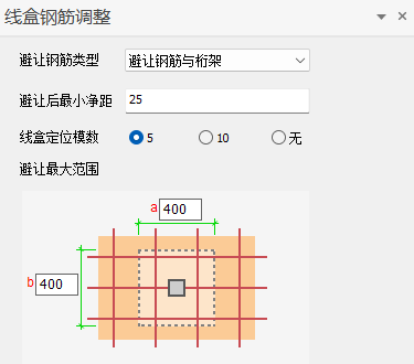 - 【避让后最小净距】:移动后的线盒外轮廓与周围钢筋外表皮的最小距离,用户可修改本参数值;