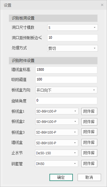 可最多选择3种不同图层的板线盒、1种墙上线盒、1种止水节以及1种钢套管。点击确定后,程序会自动生成线盒和洞口,吸附在相应的预制墙和预制板上。
