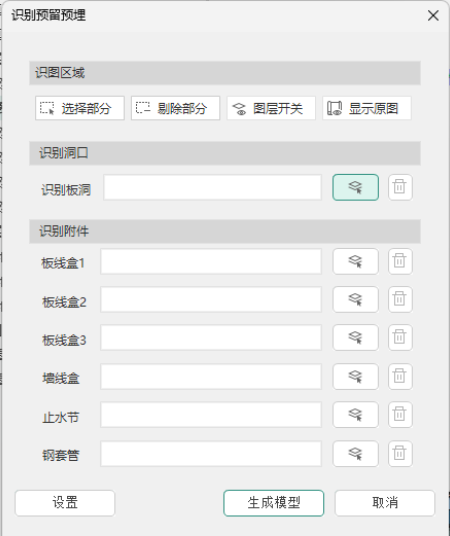 点击【新识别预留预埋】下拉对话框弹出识别预留预埋对话框,如下图所示。