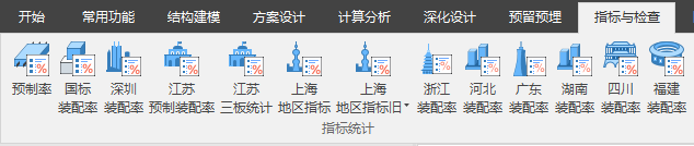 指标统计工具是基于拆分后的装配式模型(根据已有编号结果,统计自然层的拆分信息),对预制构件进行相关指标统计。目前程序包括北京预制率统计、国标装配率计算、深圳装配率计算、江苏三板统计、上海地区指标统计、浙江、河北、广东、湖南、四川、福建装配率计算。
