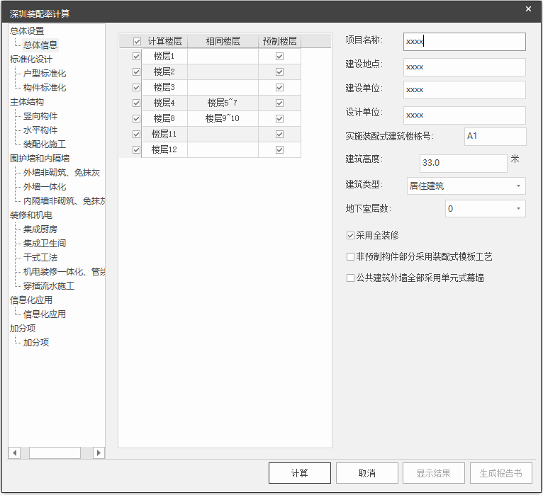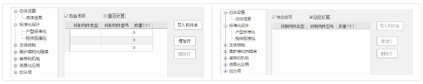 根据项目情况输入标准化构件的类型、型号和数量,程序根据深标计算相应得分;自动计算则根据自然层模型拆情况进行统计。