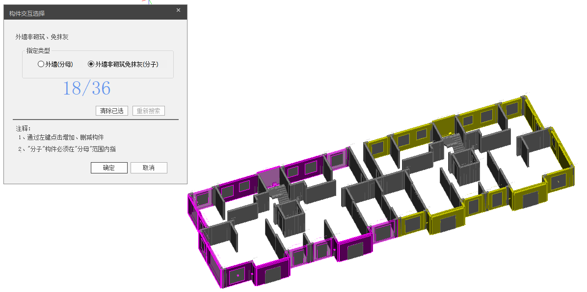 勾选自动计算时,点击“构件查删”,程序会自动搜索到所有参与计算的外围护构件并显红,在程序搜索自动结果的基础上,可通过单击构件增减参与计算的构件。若应参与计算的构件,程序未搜索到,则可通过手动单击增加,从而保证该项内容计算的准确性。根据《深标》外墙非砌筑、免抹灰项评分细则,该项按墙体长度计算。选择外墙范围后,切换选择外墙非砌筑免抹灰(分子)项,选择需要指定的墙体,按黄色显示。