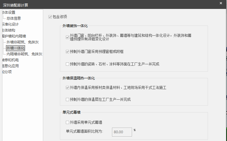 外墙一体化得分主要包括以下三个方面:外墙装饰一体化、外墙保温隔热一体化、单元式幕墙。若采用则勾选,若不采用则取消勾选。对于单元式幕墙,若采用则需手动输入实际的应用比例,且该应用比例需满足80%以上才可得分。