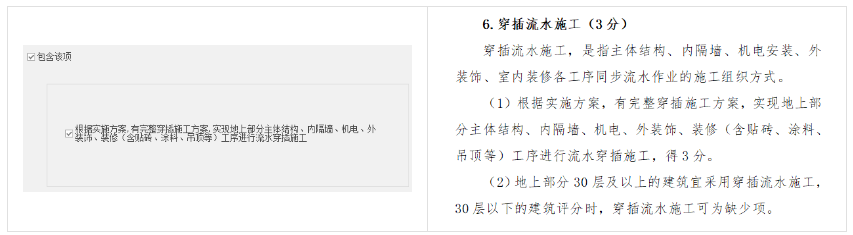 【装配化施工】:装配化施工得分项主要包括以下三个方面:①是否采用工具式脚手架;②是否采用混凝土布料机;③成品钢筋网比例。前两者,若采用则勾选,若未采用则取消勾选;第三项比例需手动输入实际的应用比值。详细评分细则请参考《深标》装配化施工项。