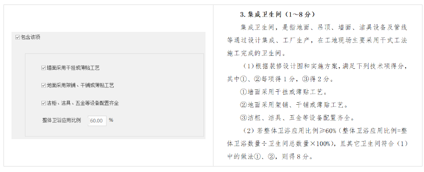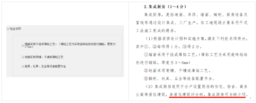 集成厨房的施工工艺形式,可通过勾选的形式进行确定,根据《深标》评分细则,若为非居住建筑,则应取消勾选‘包含该项’。