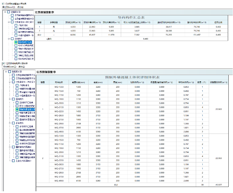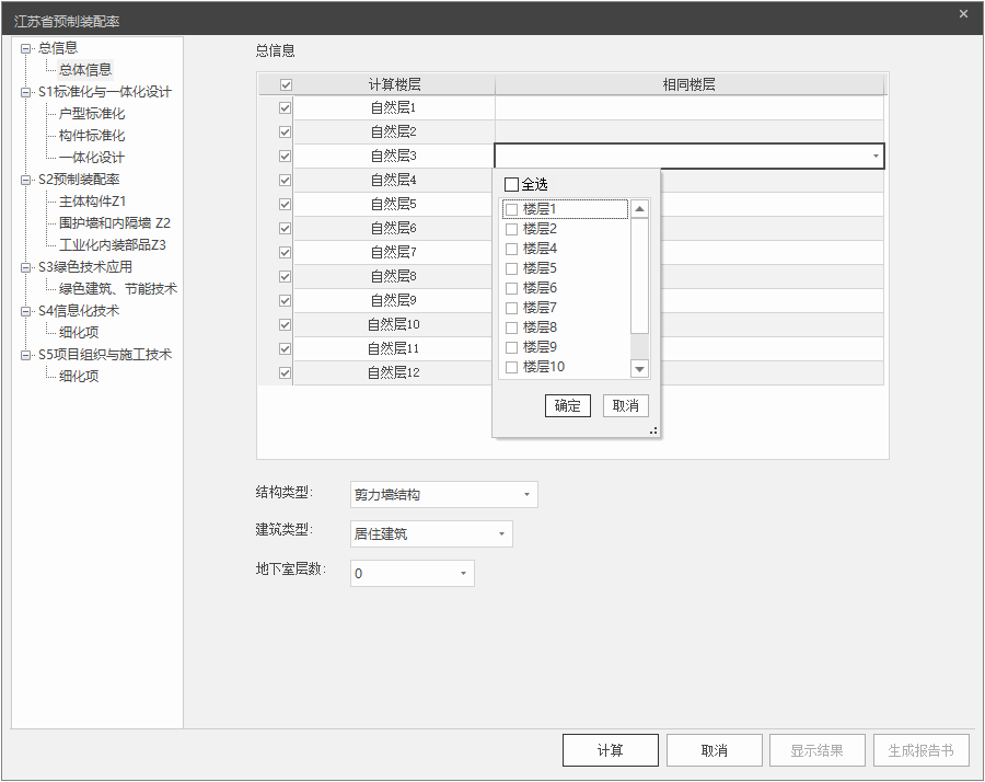 取消“自动计算”选项,可手动输入预制构件类型、型号和数量;选择“自动计算”,程序根据自然层拆分情况统计所有预制构件个数。并依据《江苏省标》条文说明5.0.3条统计相应结果。条文指出:标准化构件指单体建筑或项目中同一建筑类型实施装配式建筑的全部单体建筑中数量不少于50件的同一共模构件。