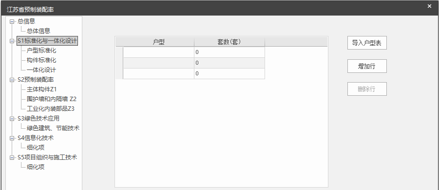 【户型标准化】:可直接导入户型表或手动输入户型名称和套数,程序按照重复使用最多的三个基本单元(户型)的数量之和占对应户型总数量计算比例,当对应户型比例大于等于70%时,按要求得3分。