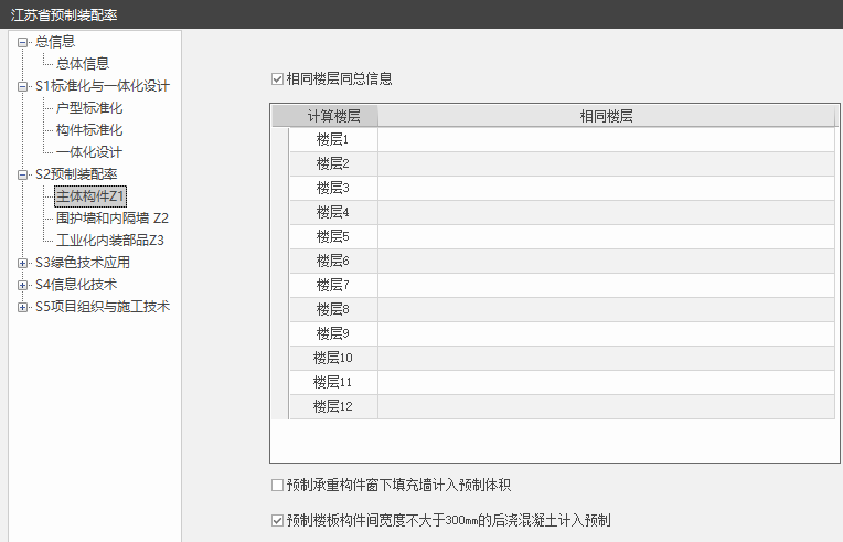 选项2:预制楼板构件间宽度不大于300mm的后浇混凝土计入预制投影面积,默认勾选,参照《江苏省标》6.2.6条要求。
