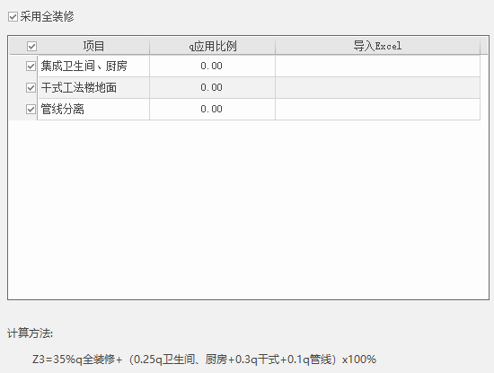 此项包括装修和设备管线的应用占比,默认勾选全装修选项。其余各项采用手动输入应用占比,数值填写范围0.00-1.00。也可补充插入EXCEL表格到报告书中。Z3的计算方法详界面下端,依据《江苏省标》6.4.1条规定。