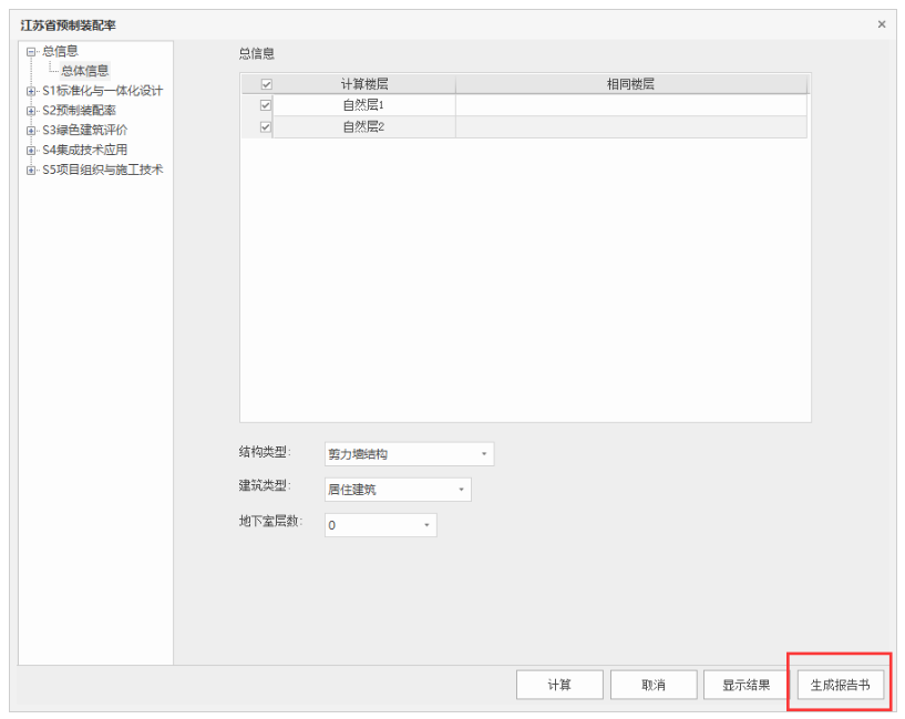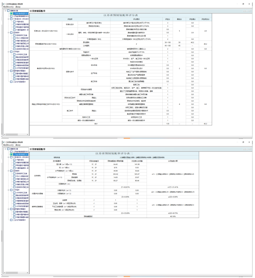 各项设置完成后,点击“计算”,输出最终结果如下图所示,可以查看江苏省预制装配率评分表总表,总表包含S1~S5各分项计算得分,查看江苏省预制装配率评分表二,分表二包含主体结构Z1、外围护和内隔墙Z2、装修和设备管线Z3各分项计算得分。