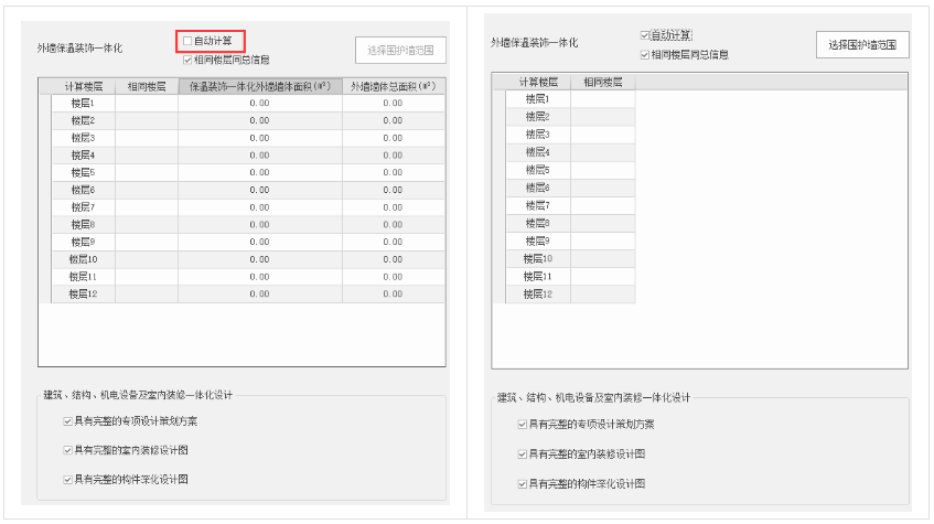 若取消勾选“自动计算”,则直接输入各层保温装饰一体化外墙墙体面积和外墙墙体总面积;若选择“自动计算”,点击“选择围护墙范围”进行选择,程序会自动搜索到所有参与计算的外围护构件并显红(同时隐藏水平构件,以便后续准确进行增减选择),在程序搜索自动结果的基础上,可通过单击或框选构件增减参与计算的构件。围护墙范围指定完成后,切换选项,在此基础上进行选择采用保温装饰一体化的墙体,选中以黄色显示。当增删墙体的选择时,左侧表内会有数字联动变化。根据《江苏省标》该项按墙体外表面积计算,可不扣除门窗洞口的面积。