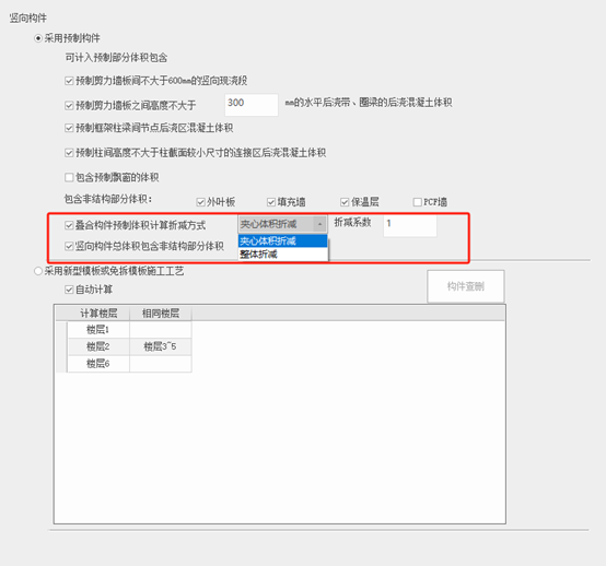 1)若勾选,则按现浇节点计算规则(T/一字型)进行计算竖向现浇段的混凝土体积,将其结果输出在“可计入预制构件的体积”表格中。