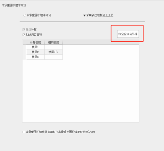若勾选【采用新型模板施工工艺】则可以指定全现浇外墙,如图所示