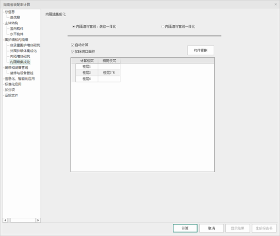 内隔墙集成化可选择【内隔墙与管线、装修一体化】、【内隔墙与管线一体化】,提供自动计算和手动输入两种方式,提供构件查删命令,点击后如下图所示