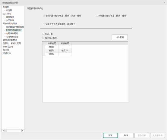 可选择【非砌筑围护墙与保温、隔热、装饰一体化】、【预制围护墙与保温、隔热一体化】和【采用干式工法保温装饰一体化施工】,三者都提供自动计算和手动输入两种方式