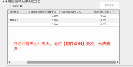 【采用新型模板或免拆模板施工工艺】:勾选则默认开启自动计算,也可取消自动计算手动输入采用新型模板或免拆模板施工工艺现浇墙墙体体积和竖向构件总体积