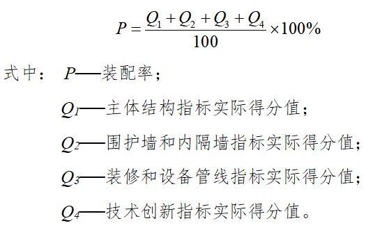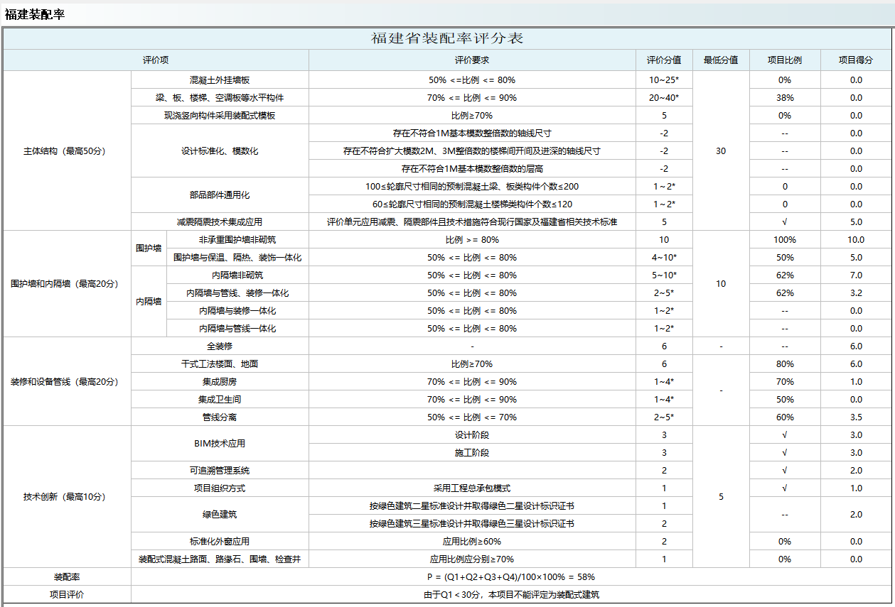 福建省装配率根据闽建〔2020〕4号相关条文进行统计,以下简称《福标》,其中规定单体建筑装配率需应不低于50%。计算公式: