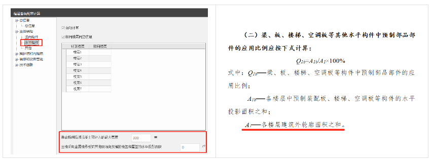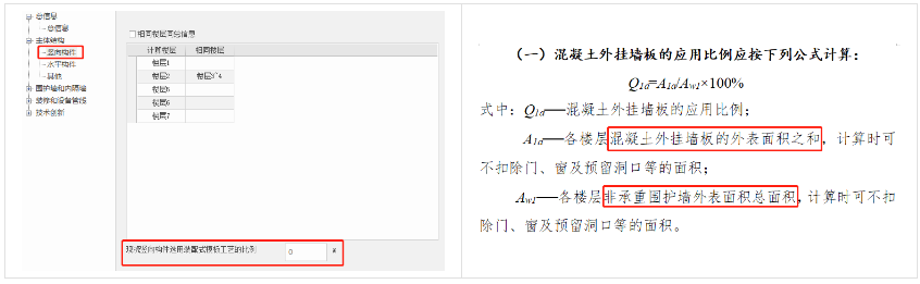 仅计算预制混凝土外挂墙板的外表面积比,与国标装配率有较大差异。外挂墙板的范围依据围护墙指定结果进行统计。