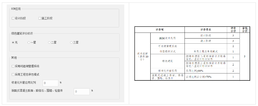 此项包括BIM技术应用、可追溯管理系统、项目组织方式、标准化外窗应用、装配式混凝土路面、路缘石、围墙、检查井。用户根据项目实际情况做出选择,按要求统计分数。
