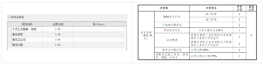 此项包括装修和设备管线的应用占比,默认勾选全装修选项。其余各项采用手动输入应用占比,数值填写范围0.00-1.00。也可补充插入EXCEL表格到报告书中。程序界面和评分标准如下图所示: