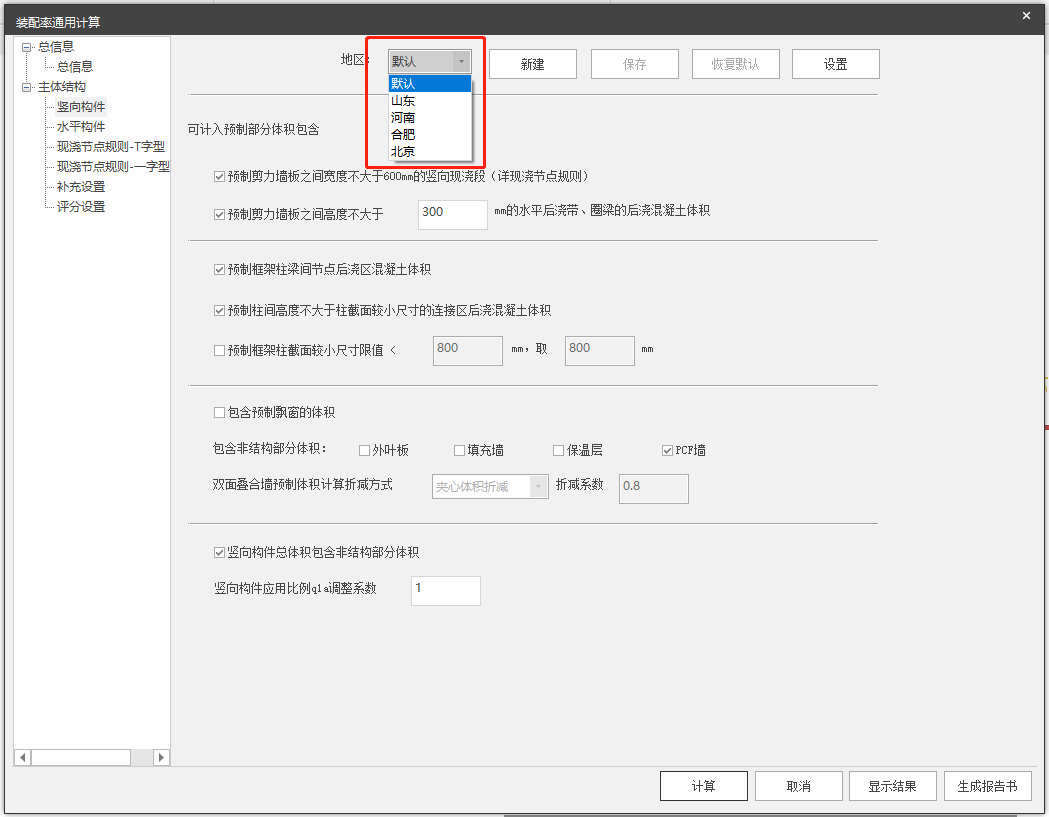 根据全国多地装配率主体结构部分的计算规则进行总结后,此功能针对这部分的计算方进行分类汇总。用户可根据不同地区要求进行计算方案的配置,并输出相应结果。默认提供山东省、河南省、合肥市、北京市的方案,用户可直接选择进行计算。
